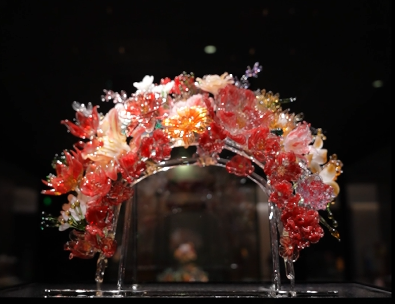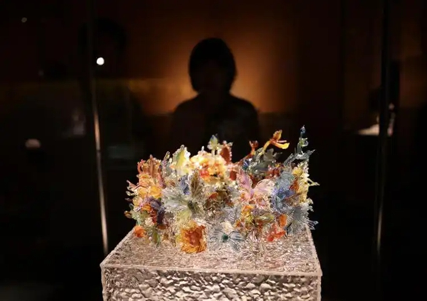 One of the highlights was a glass replica of a crown adorned with dragon and phoenix motifs, created by three young artists. The original crown, once owned by Empress Xiaoduan of the Ming Dynasty (1368–1644), is renowned for its intricate design and exceptional craftsmanship. The Liuli replica took two months to complete and incorporates 4,800 individual Liuli beads.